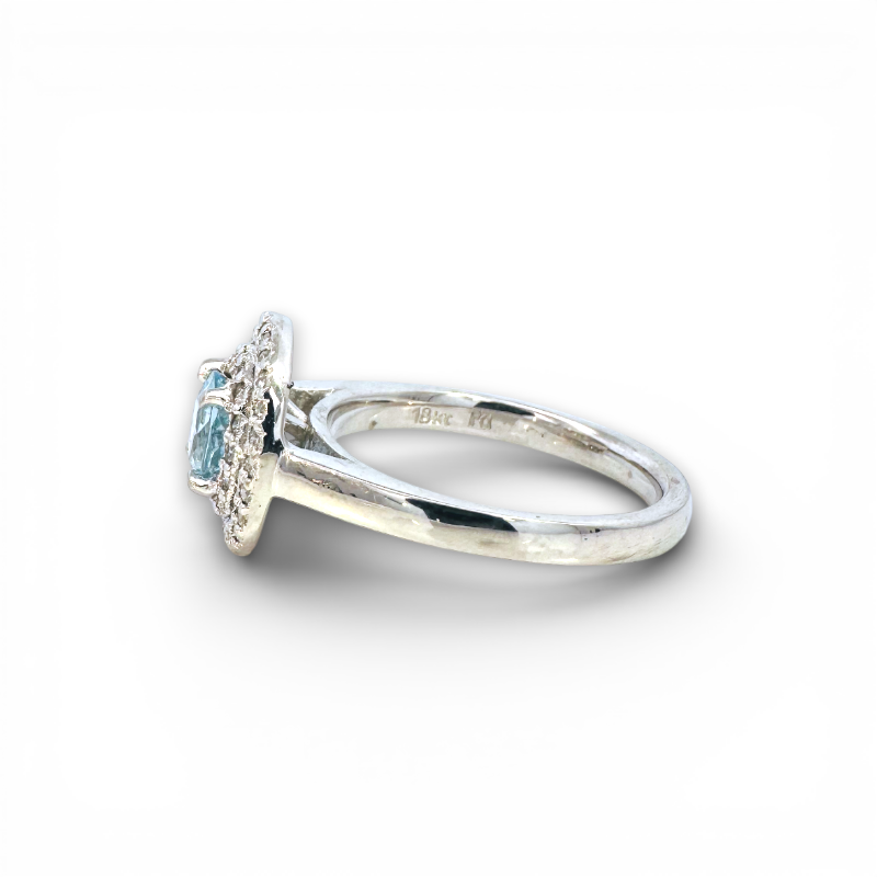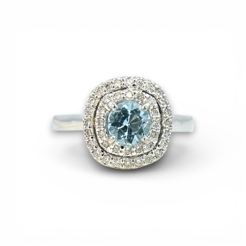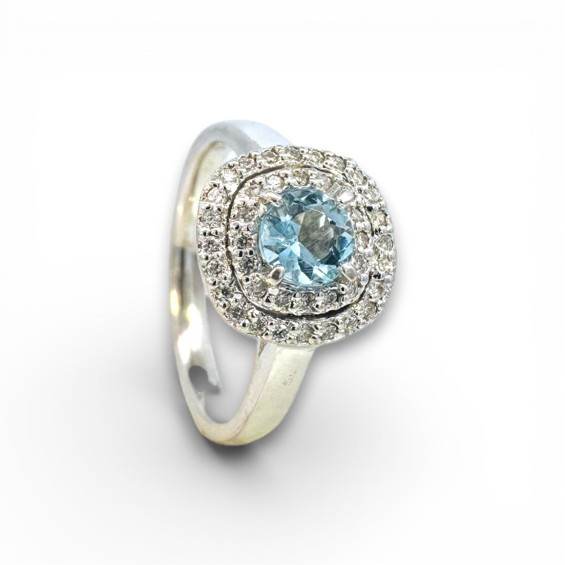 Anillo solitario aguamarina redonda doble halo diamantes oro blanco 18K