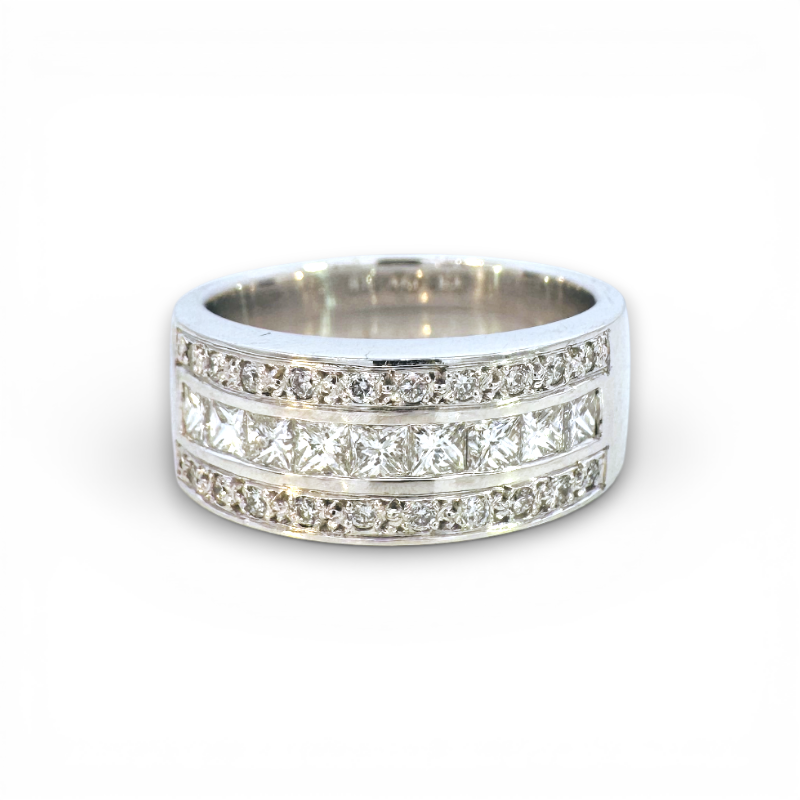 Anillo cintillo de diamantes Princess y brillantes en oro blanco 18K